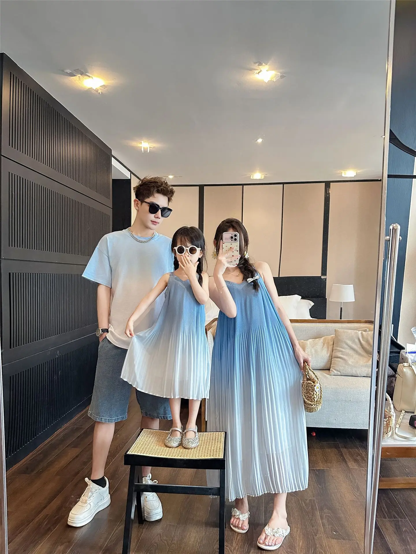 Family Fashion Beach Mother Father and Girl Boy Blue Clothes Vacation Look Mom Daughter Holiday Dress Korean Dad Son T Shirts